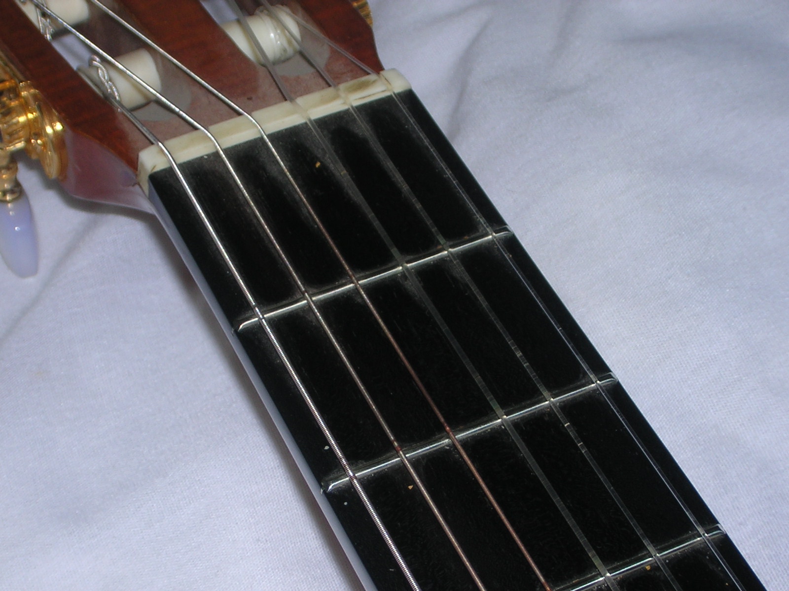 Fingerboard nut should be well shaped with no visible cracks or burrs. On some guitars the nut is held by only it's string tension. If you prefer it glued, use a tiny amount of Titebond glue to allow for easy removal later.