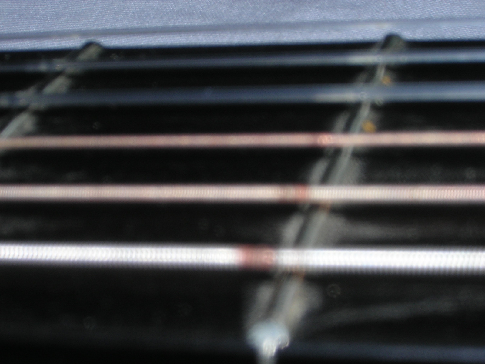 These eight week old strings on this guitar have been played extensively. The wound strings are discolored and are badly worn where they meet the frets. They should have been changed about six weeks ago because they lack the rich tones of newer strings. The life span of strings vary from player to player. A moderate player may go four to six months on a set of strings, while a professional may change them almost daily.