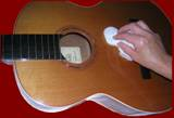 Polish hard-to-reach areas (bridge, bridge to sound hole, headstock...) with a name brand guitar polish and cheese cloth.