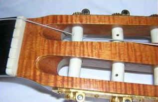 Notice the winding on rollers is in the direction of corresponding tuner knobs. (Bass strings wind to the bottom of the picture, Treble strings wind to the top.) This will allow the strings to travel from the fingerboard nut to the rollers without touching the headstock.