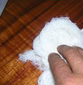 A rubbing compound is used to polish the frets with even, counted strokes in the direction as shown. Do not let the rubbing compound rest on a guitar finish. It is petroleum-based and if left unattended for an extended time will leave blemishes.